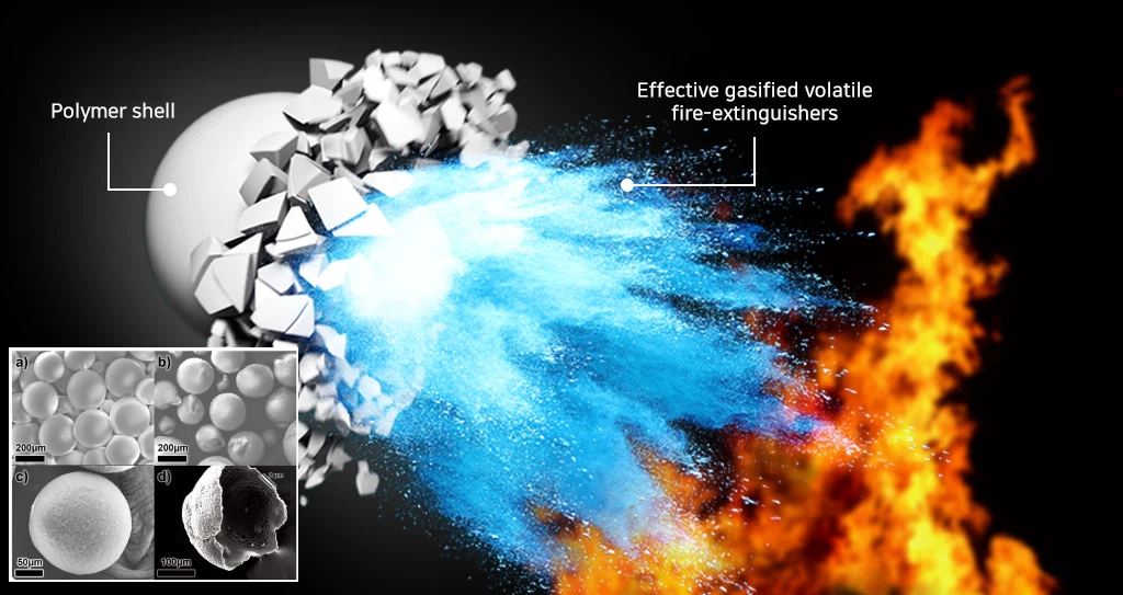We provide a microencapsulated fire-extinguishing powder(20-2000 um) that automatically releases its agent when heated. This self-activating system suppresses fires at their origin inside enclosed electrical equipment, such as cabinets and switchgear. It offers a compact, maintenance-free solution for early-stage fire prevention without external power or manual intervention.